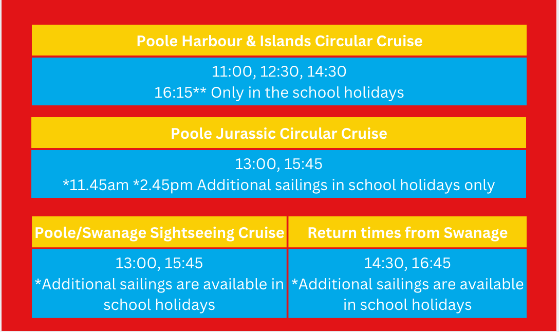 Please make sure you have sufficient time to reach your choosen cruise if you are arriving by the Open top Hop-on Hop-off bus. You will also need to check bus return times if you are travelling back to Bournemouth with us.
